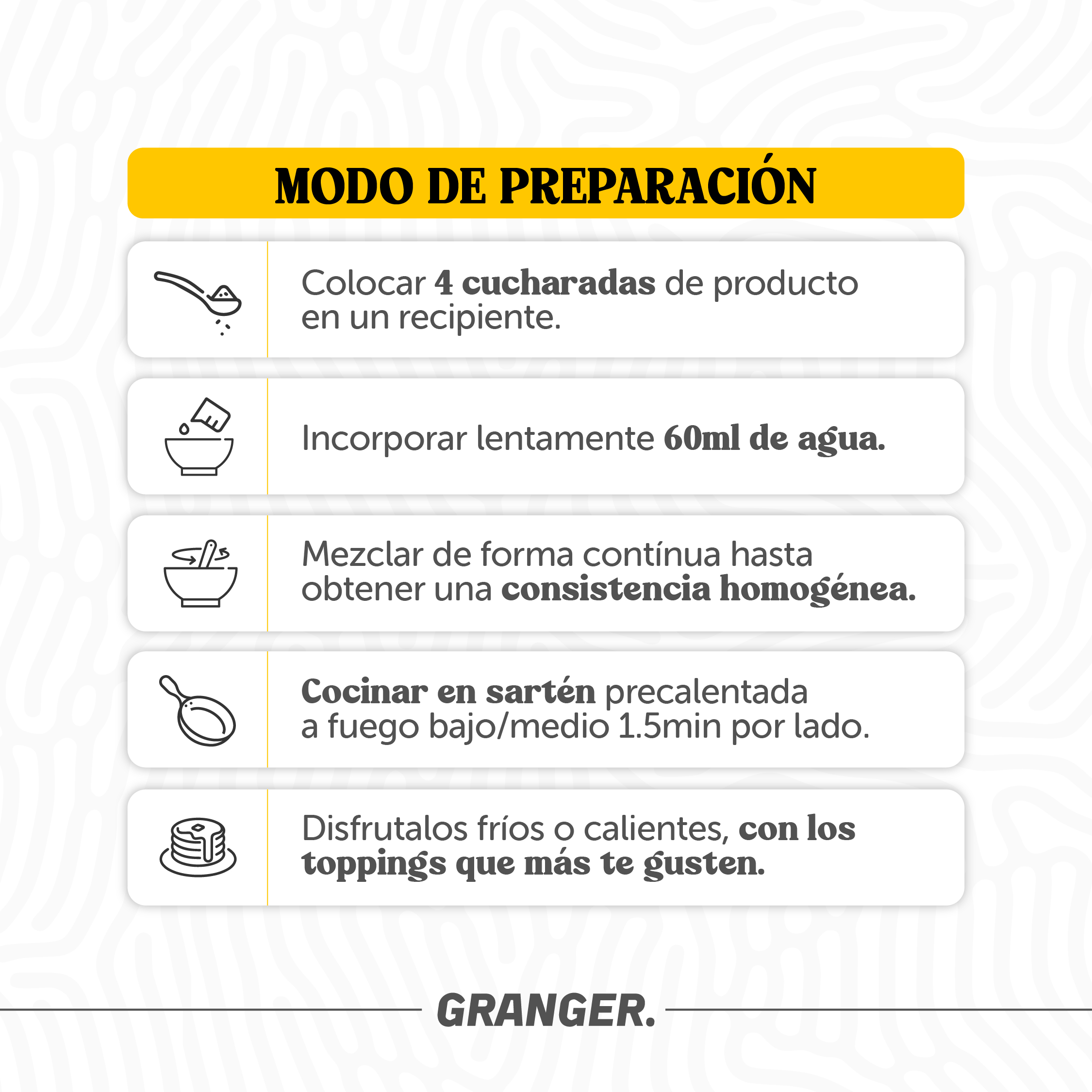 - Calidad Granger: ingredientes seleccionados, excelente perfil nutricional y pensado para un estilo de vida activo.