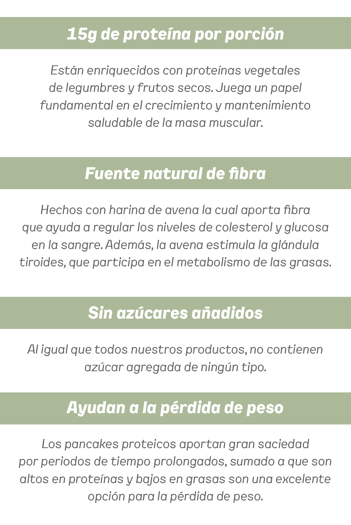 Es un pancake proteico elaborado con fuentes vegetales de proteína y fibra, sin azúcares agregados ni grasas trans. Una opción práctica, deliciosa y 100 % vegetal, pensada para quienes buscan alimentarse de forma saludable, sin ingredientes de origen animal. Ideal para desayunos, meriendas o snacks funcionales que te nutren y te dan energía real.