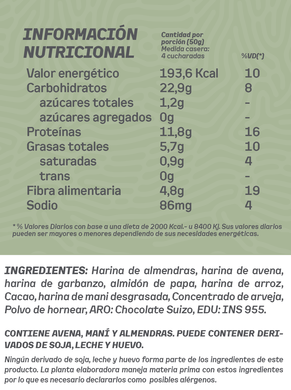 INGREDIENTES: Harina de almendras, Harina de avena Libre de gluten, Harina de garbanzo, Harina de arroz, Cacao, Harina de mani, Concentrado de arveja, Polvo de hornear, ARO: Chocolate Suizo, EDU: INS 955.